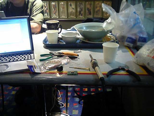喫茶店でコンセントを借りてハンダづけ。